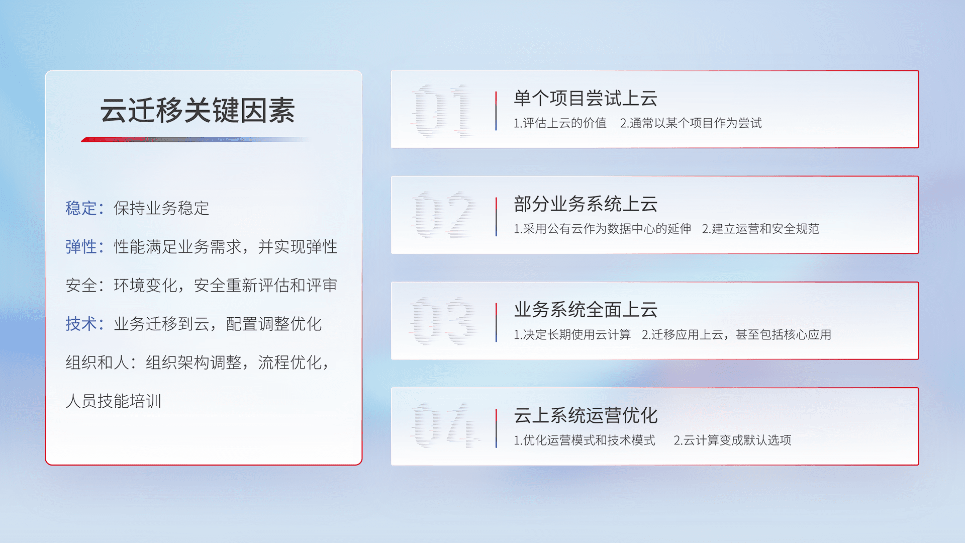 结合实际业务,,,,从规划设计、、云平台选型、、云原生改造、、数据迁移、、、集成交付,,,,迁移全过程为客户识别最佳上云路径,,,,做好风险识别管理,,,,设计网络架构、、、身份权限、、、、安全审计合规、、、、操作审计、、、日志审计、、监控告警策略、、、多站点容灾设计等,,对云上基础设施进行整体规划,,提升IT治理水平,,,,以满足弹性、、高可用、、、、高性能的需求。。。。