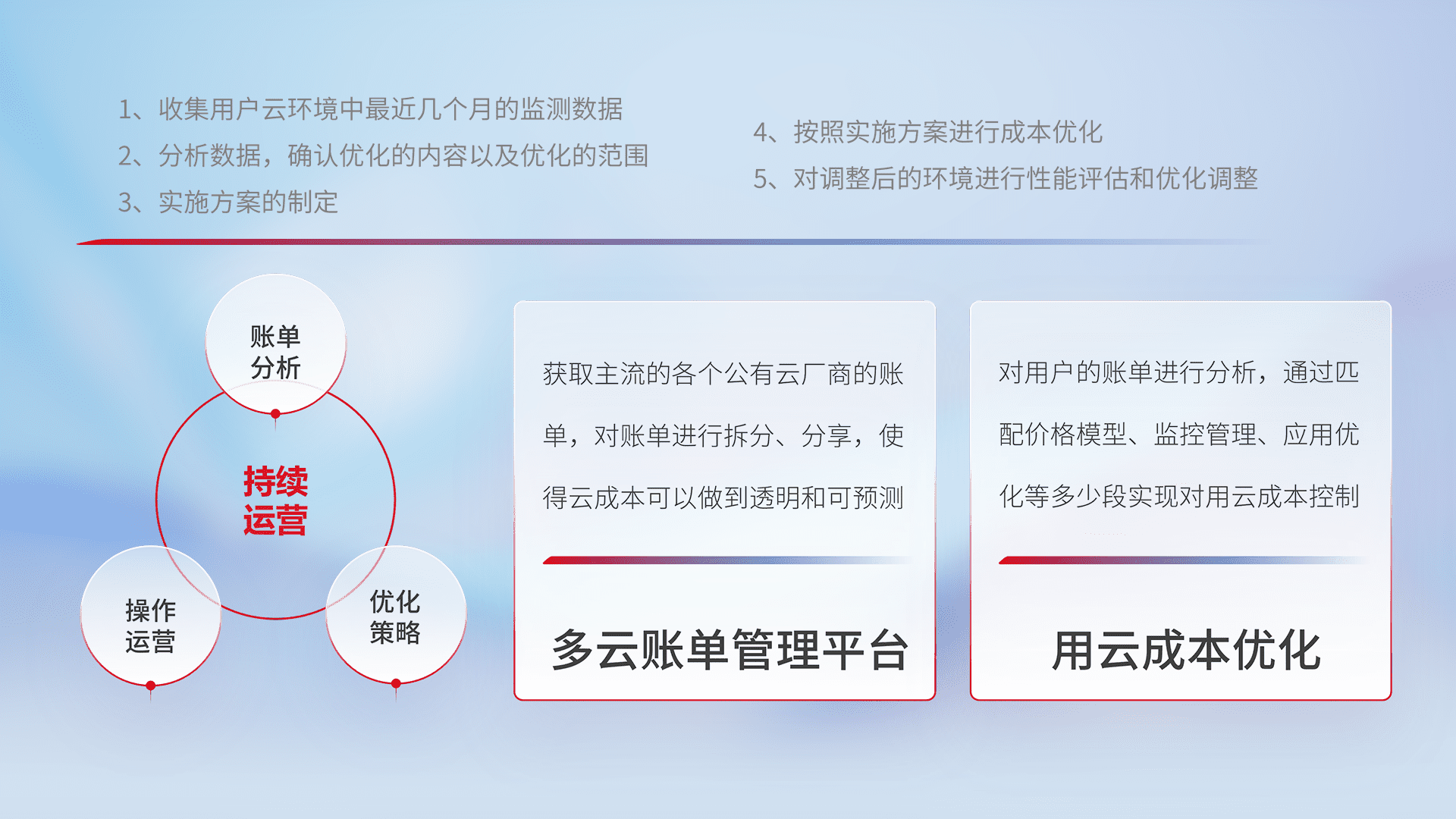 通过多云纳管,,,,以统一的资源数据模型把客户的云资源进行抽象和封装,,,,进而实现对多云资源的统一操作,,保障云资源管理的可靠性、、稳定性与可用性。。量身定制化运维内容,,,,配置、、、、开发运维、、、、补丁管理、、、备份、、监控、、、认证和访问管理、、、审计和日常巡检等,,,保障在用云过程中的可靠度,,,稳定度以及高可用率。。